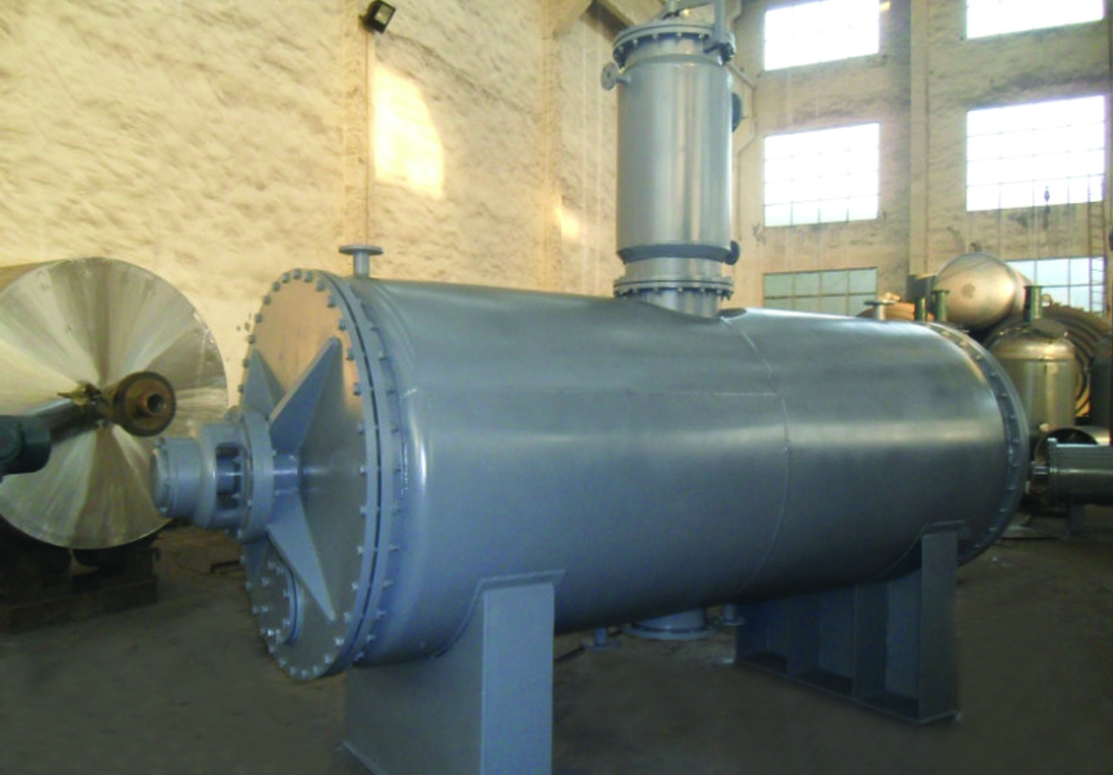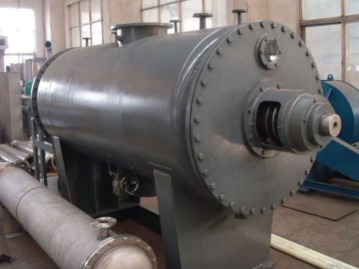 被干燥物料從殼體上方正中間加入,在不斷正反轉動的耙齒的攪拌下,物料軸向來回走動,與殼體內壁接觸的表面不斷更新,受到蒸汽的間接加熱,耙齒的均勻攪拌,粉碎棒的粉碎,使物料內的水份氣化,在真空系統的作用下,使被干燥物料內部水份和表面水份有利的排出,氣化的水份干式除塵器、濕式除塵器、冷凝器,從真空泵出口處放空。