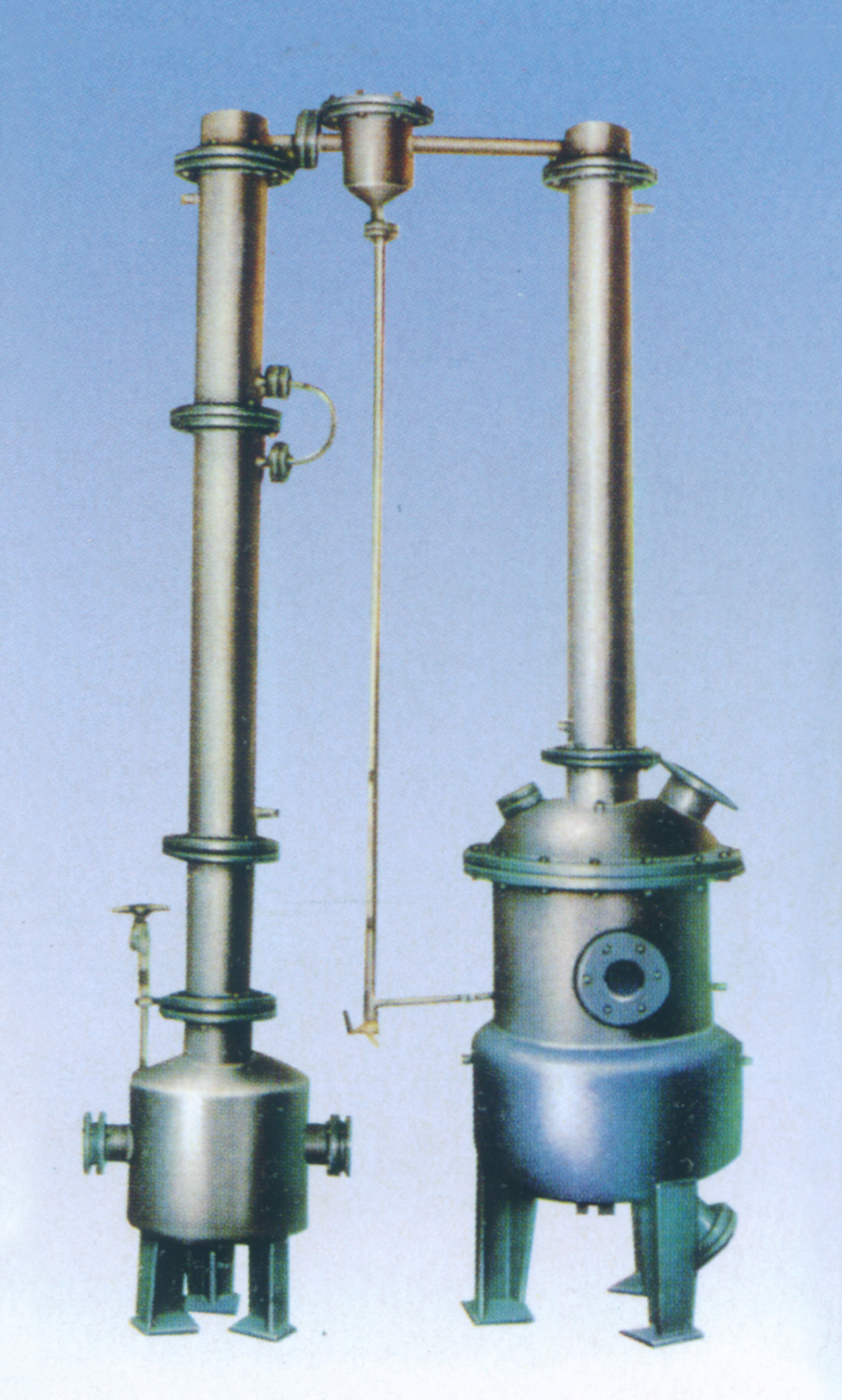 本設(shè)備主要包括濃縮罐、一冷凝器、汽液分離器、二冷凝器、冷卻器、受液桶六個部件組成,全部由不銹鋼制造。濃縮罐為夾套結(jié)構(gòu),冷凝器為列管式,冷卻器為蛇管式。