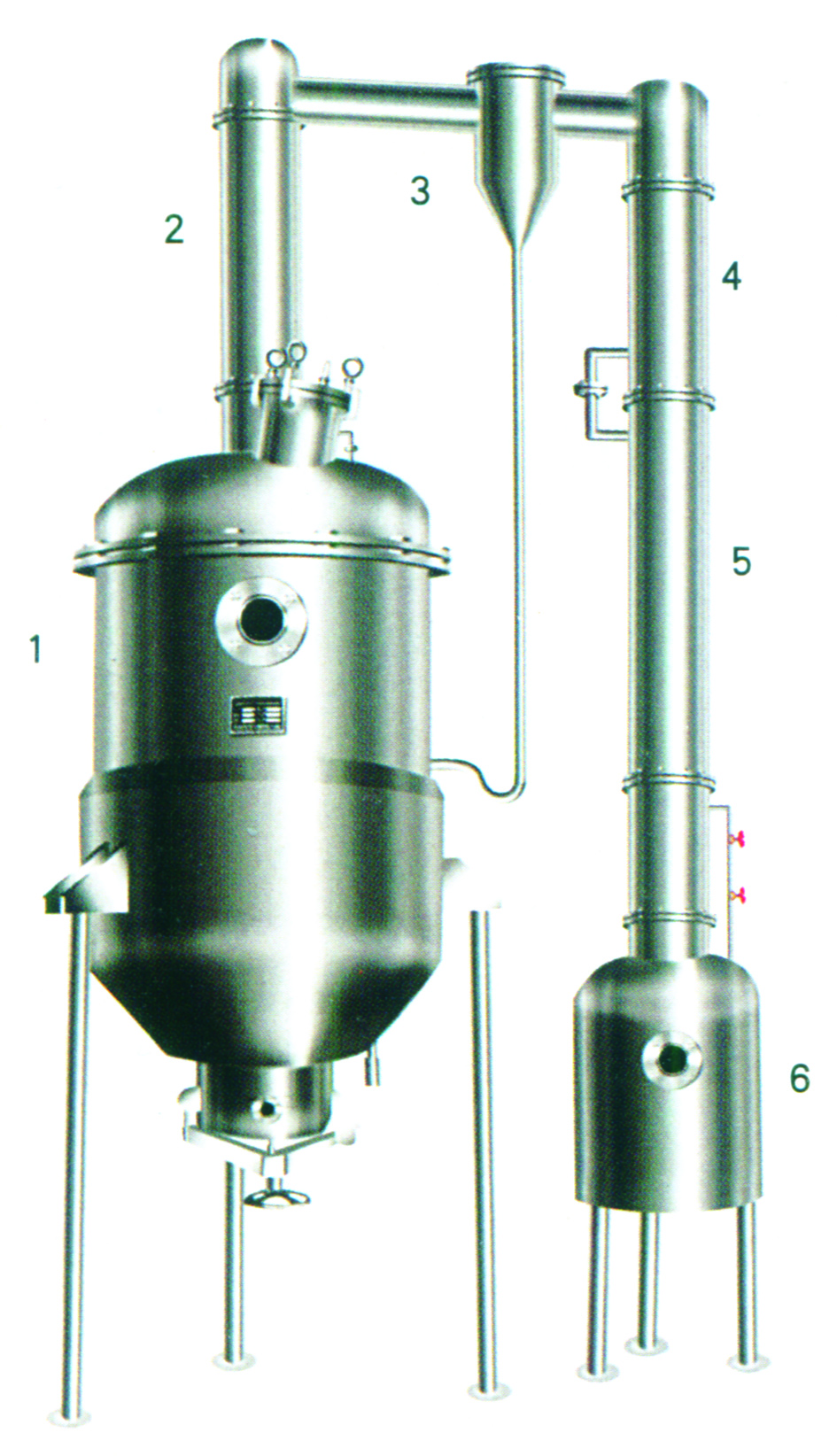 1.濃縮罐、2.一冷凝器、3.汽液分離器、4.二冷凝器、5.冷卻器、6.受液槽。